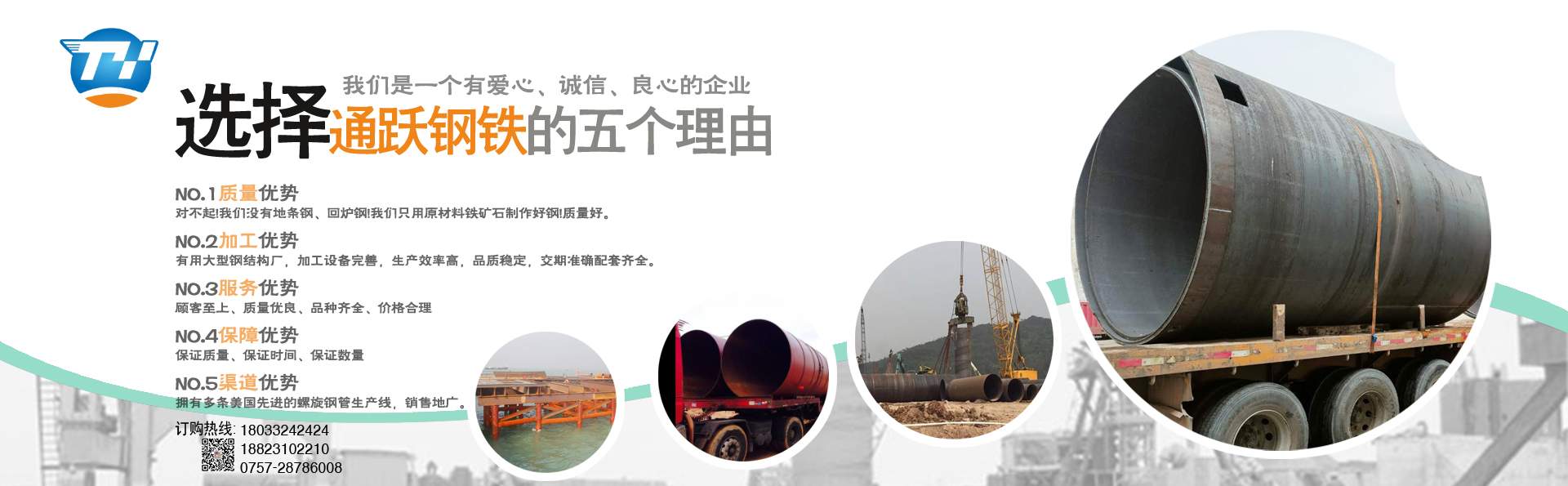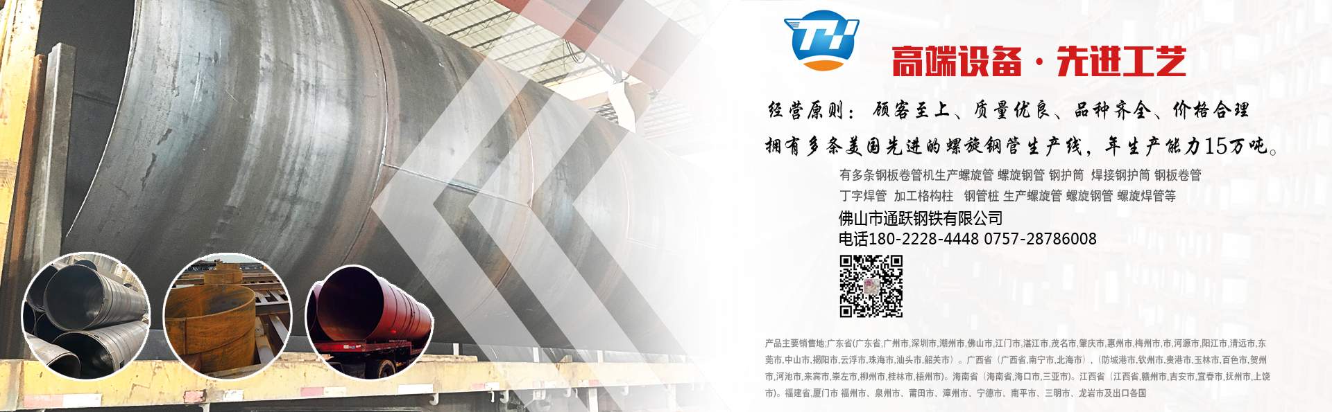 佛山市通躍鋼鐵有限公司 電話180-2228-4448 0757-28786008 擁有多條美國先進的螺旋鋼管生產線,生產直徑φ159-φ3620mm(壁厚6mm-20mm)的雙面埋弧螺旋焊鋼管,年生產能力15萬噸。 生產螺旋管 螺旋鋼管 螺旋焊管 規格厚度6mm-20mm 直徑159mm-3620mm 有多條鋼板卷管機生產規格厚度6mm-70mm 直徑400mm-5020mm 螺旋管 螺旋鋼管 鋼護筒 焊接鋼護筒 鋼板卷管 丁字焊管 加工格構柱 鋼管樁 材質Q235B Q345B Q235A 45# 20# Q420D Q390··· ……